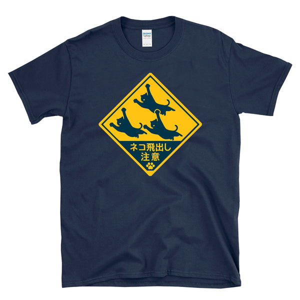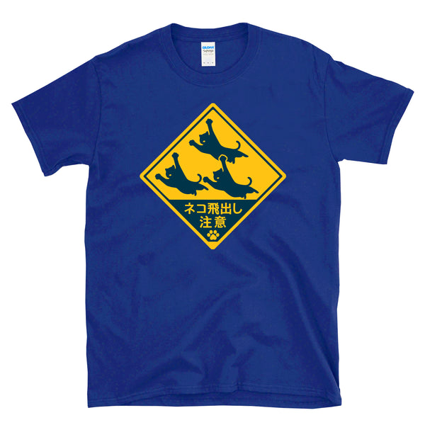 BEWARE OF CATS JUMPING OUT Street warning sign - clever, sarcastic, witty, humor novelty vintage throwback retro style tee. Great for a man or woman who loves Japanese culture & cat jokes. Funny conversation starter. These are on streets in Japan to protect cats Awesome birthday present or holiday idea for a mom, dad, sister, brother, aunt, uncle, boss, vet, or best friend who loves cats, kittens, black kitties, & felines. Wear this to a party, the gym, school, work, or playing a sport with friends to get laughs. For fans of meme pop culture too. Printed on a Soft Style 64000 shirt, please check size chart for correct fit. • 100% ring-spun cotton (Dark Heather is 65% polyester, 35% cotton) 4.5 oz. • Pre-shrunk