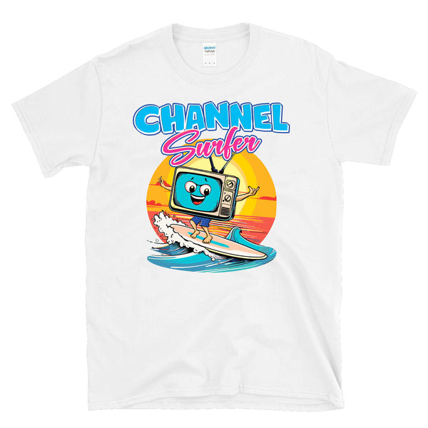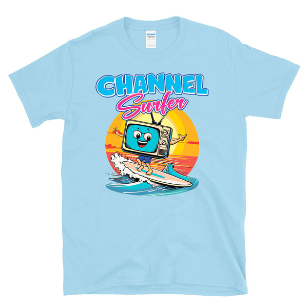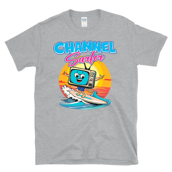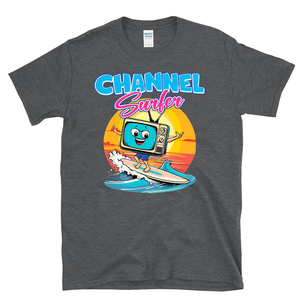 CHANNEL SURFER - Amazing pun for anyone that loves to surf channels to watch sitcoms, movies and documentaries and the ocean and the beach too. Hang ten with this funny tee. Features a retro style graphic for a vintage tee look and beauty vibe with a funny ocean sunset scene. Perfect for a vacation, the gym, work, a pool party or starting conversation. Great item for fans of vintage and retro beach style surf and skate fashion and 80s and 90s punny tees. Printed on a 64000 soft style tee. Check size chart to ensure the right fit. • 100% ring-spun cotton (Sport Grey/Dark Heather is 65% polyester, 35% cotton) • 4.5 oz • Pre-shrunk