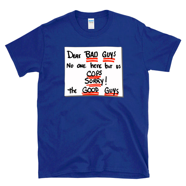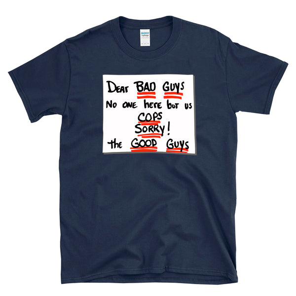 Dear Bad Guys No One Here But Us Cops Sorry! The Good Guys - The note you leave the bad guys when they are coming for you on Christmas. Great for fans of police, law enforcement, action movie heroes and 80s and 90s pop culture. If you are getting too old for the bad guys but not done taking them out and saving the day, this is for you. Great birthday present or holiday idea for a good guy you know that works as a cop or detective! Or a fan of other pop culture and 80s and 90s action movies, thrillers, and vintage graphic tees! Printed on a Gildan 64000 soft style tee. Check size chart to ensure the right fit. • 100% ring-spun cotton (Dark Heather is 65% polyester, 35% cotton) • 4.5 oz • Pre-shrunk