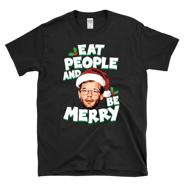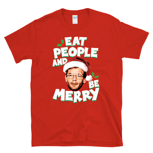 EAT PEOPLE AND BE MERRY - Twisted pun to the "eat, drink & be merry" holiday saying with a jolly Jeffrey in a Santa Claus hat. Wear this to an ugly sweater party for the holidays and to celebrate the Christmas season with a twist.