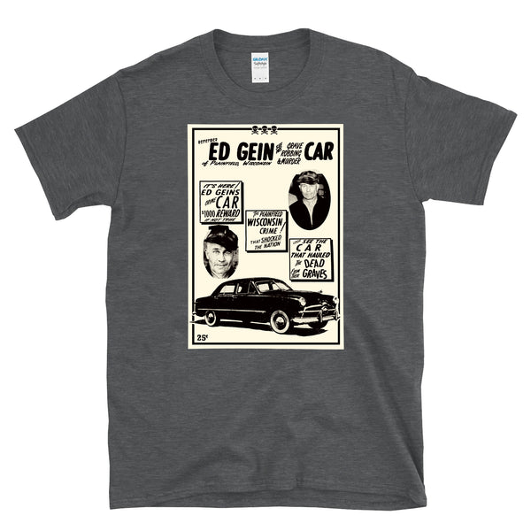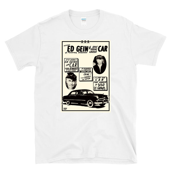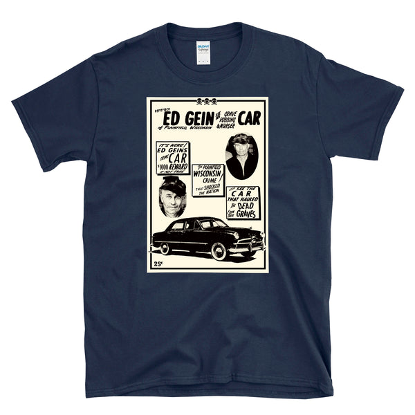 Awesome Ed Gein Car exhibit advertisement flier t-shirt for fans of true crime and stories like that of the original body snatcher, Edward Theodore Gein also known as "the Butcher of Plainfield" or "the Plainfield Ghoul". Ed went on a notorious crime spree in the 1950s that horrifically inspired horror movies like the chainsaw massacre dynasty. This pop culture inspired tee is a must have for someone that loves horror movies and true crime and looney cartoons!