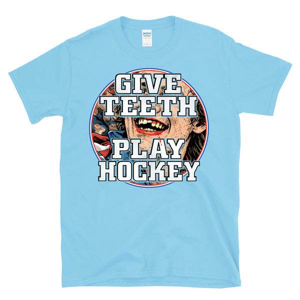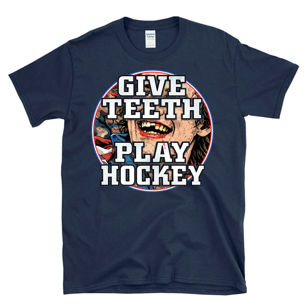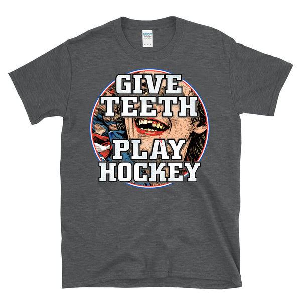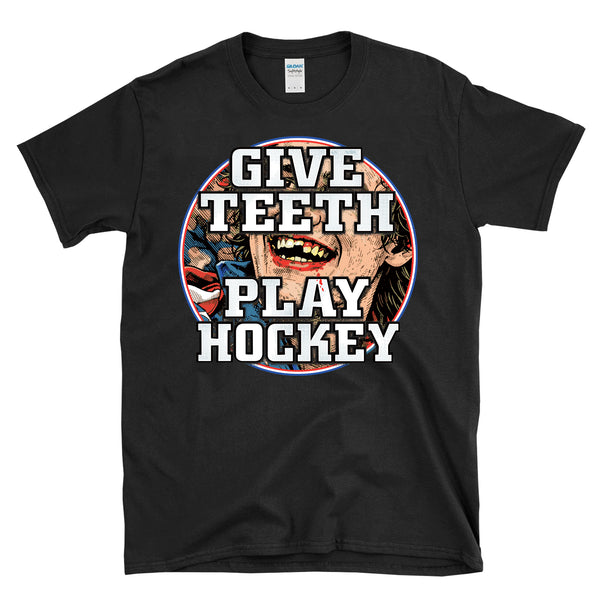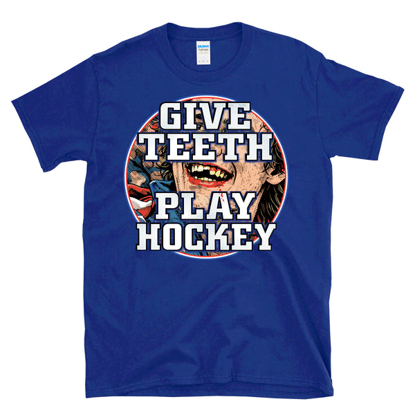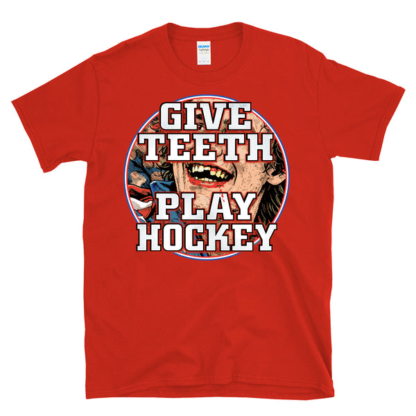 GIVE TEETH PLAY HOCKEY - Victorious bloody teeth graphic is great for a fans hockey like of the olympic hockey team gold medal winning 2026 team to celebrate the overtime victory in Italy. Great for a dentist or dental assistant that plays hockey or someone that has lost a few teeth on the ice. Patriotic and bold missing teeth graphic is awesome and great for any fan of America and hockey and winning. Printed on a 64000 soft style tee. Check size chart to ensure the right fit. • 100% ring-spun cotton (Light/Dark Heather is 65% polyester, 35% cotton) • 4.5 oz • Pre-shrunk - Let's go USA with this awesome retro, vintage style, heroic athletic themed cool graphic artwork t-shirt. Perfect for a man or a woman, great birthday present or holiday idea for a true fan of hockey and sports. - Celebrate your love of America and hockey in this radical shirt.