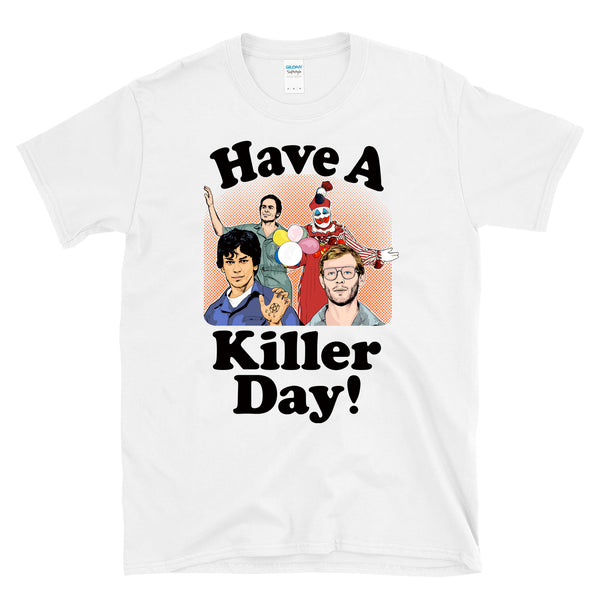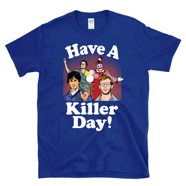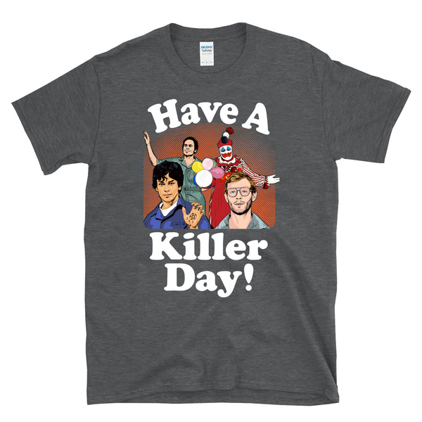 HAVE A KILLER DAY! - vintage retro style artwork has a twisted cartoon montage of pogo, jeffrey, richard and ted wishing well to anyone that sees it. If you like stories about killers like Ed Gein, Ramirez the night stalker, Ted Bundy, Pogo the clown aka John Wayne Gacy, and the cannibal from Milwaukee Jeffrey Dahmer, you will love this. Check size chart for correct fit. Printed on a 640000 soft style blank for comfort. • 100% ring-spun cotton (Dark Heather is 65% polyester, 35% cotton) 4.5 oz • Pre-shrunk