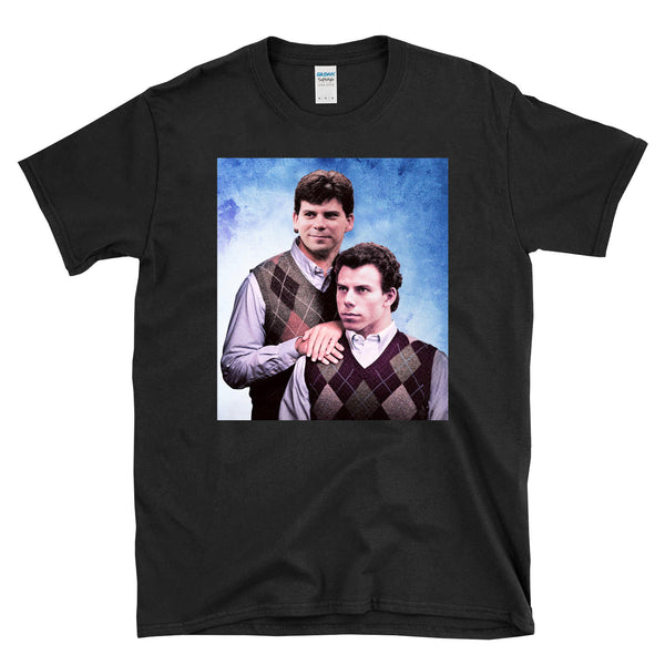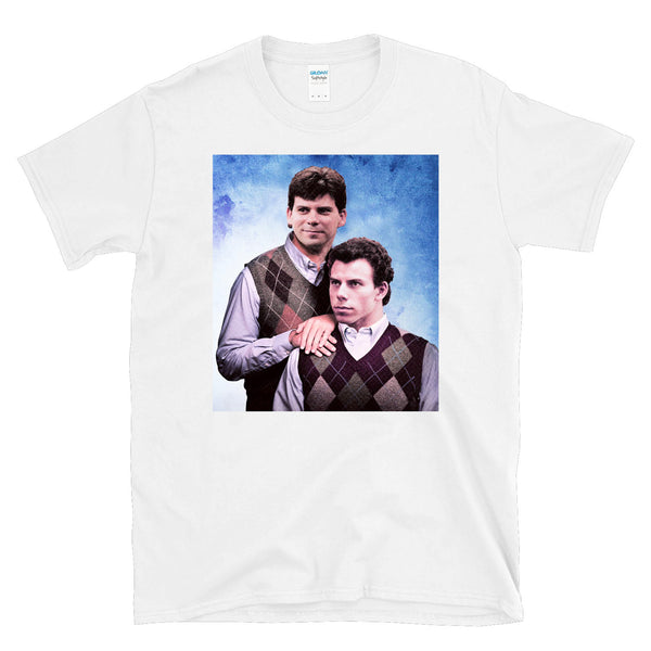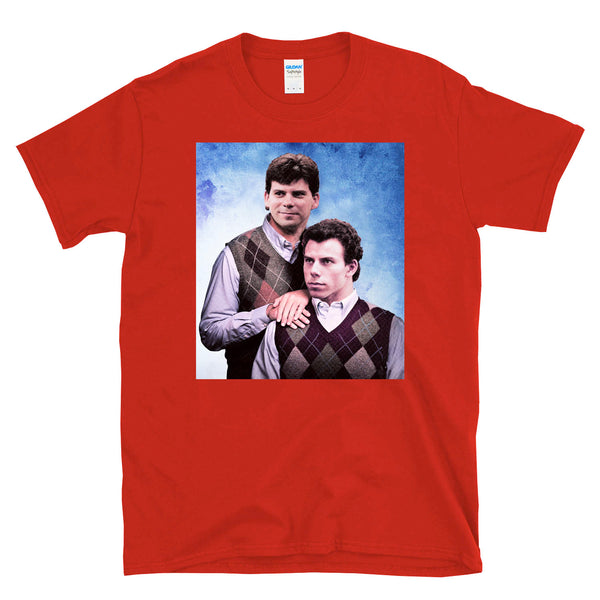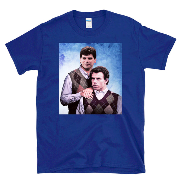 Parody brothers portrait shirt for the Menendez boys. Cheer on your sick and twisted brothers Erik and Lyle with this controversial tee. Sure to start conversation at a party or work or school or while binging your favorite true crime documentary or biography on tv. Wear this to a holiday party or halloween event, horror or comedy movie convention or a concert to start conversation . Great for true crime and horror movie fans, and makes for a unique and twisted present for your favorite weirdo. Has a 80's and 90's heavy metal rock tee or pop music or rap and hip hop tee vibe as well. Brotherly love at its finest! Printed on a 64000 soft style tee. Check size chart to ensure the right fit. • 100% ring-spun cotton (Dark Heather is 65% polyester, 35% cotton) 4.5 oz • Pre-shrunk