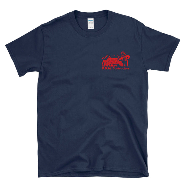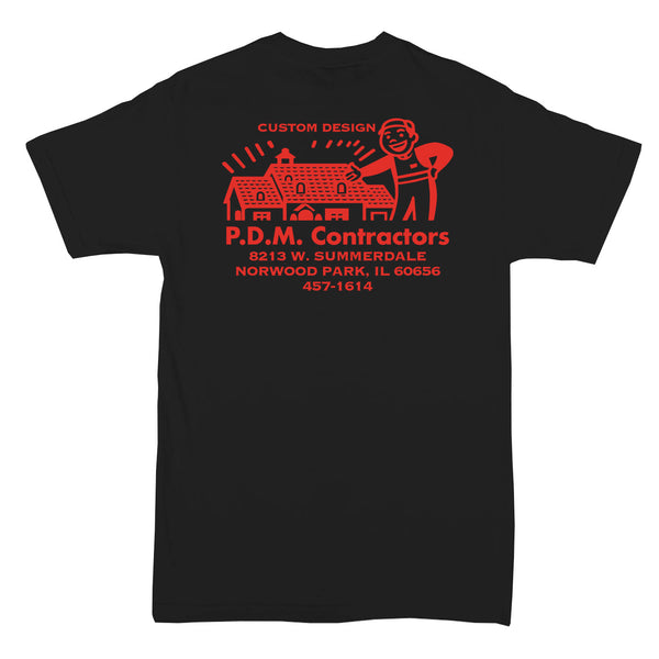 P.D.M. Contractors logo T-shirt - 2 sided version - For fans of true crime history, horror movies, cosplay, serial killers, Halloween, and killer clown documentaries. This was a business in the 1970s owned by John Gacy in the suburbs of Chicago. Business card artwork has been reproduced for history buffs & true crime fans. Wear this to a crime convention or horror convention to start conversations and get shocking looks. Great for a man or woman with a a dark and twisted sense of humor.