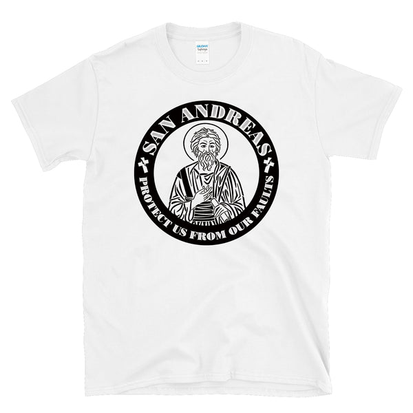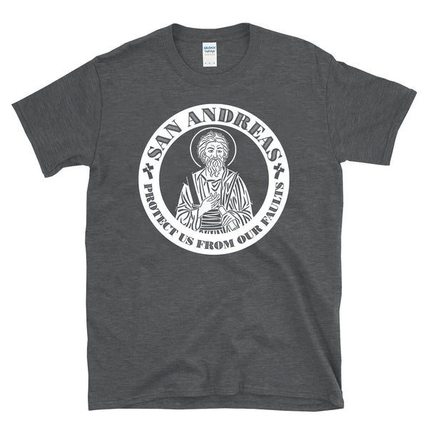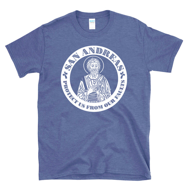 SAN ANDREAS PROTECT US FROM OUR FAULTS - Punny t-shirt with a fun pun for someone who is a fan of apostles & saints and fault lines or seismology or a seismologist. Wear this on your next vacation to California or to look at a fault line or a church picnic. Features a stencil type graphic for a vintage tee look and retro vibe. Great for Mom, Dad, Sister, Aunt, Uncle, person named Andrew, bestie & more. A classic pun for would make a birthday present idea or holiday idea for a religious historian or scientist or just funny person. Great novelty t-shirt for a funny vintage style retro shirt collector! Printed on a 64000 soft style tee. Check size chart to ensure the right fit. • 100% ring-spun cotton (Dark Heather/Royal Heather is 65% polyester, 35% cotton) • 4.5 oz • Pre-shrunk