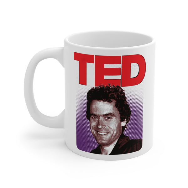 TED - sinister grinning face of Bundy. This talks parody red logo graphic coffee or tea mug is sure to shock and show off a twisted sense of humor for a man or woman who loves serial killers and true crime.