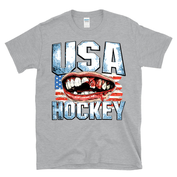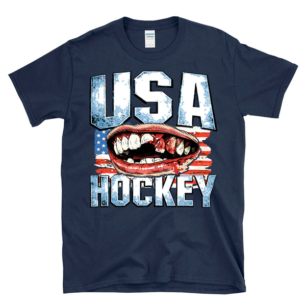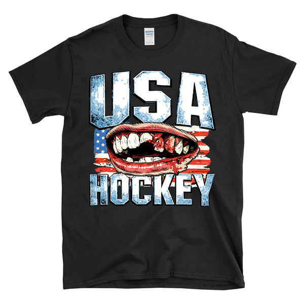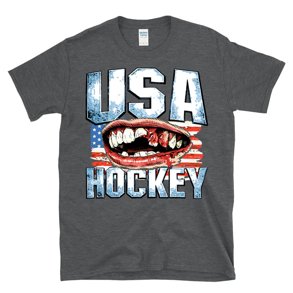 USA HOCKEY - Victorious bloody teeth graphic is great for a fan of the olympic hockey team gold medal winning 2026 team to celebrate the overtime victory in Italy. Patriotic and bold missing teeth graphic is awesome and great for any fan of America and hockey and winning. Printed on a 64000 soft style tee. Check size chart to ensure the right fit. • 100% ring-spun cotton (Light/Dark Heather is 65% polyester, 35% cotton) • 4.5 oz • Pre-shrunk - Let's go USA with this awesome retro, vintage style, heroic athletic themed cool graphic artwork t-shirt. Perfect for a man or a woman, great birthday present or holiday idea for a true fan of hockey and sports. - Celebrate your love of America and hockey in this radical shirt.