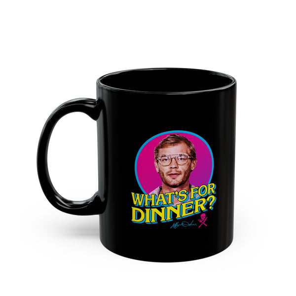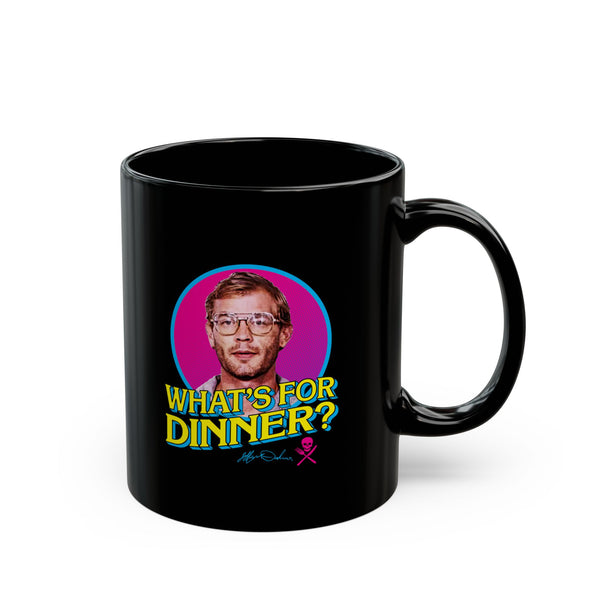 This vintage looking coffee or tea mug features a colorful pun on Jeffrey Dahmer, notorious cannibal and serial killer from Milwaukee asking the question "What's for dinner?" Great for true crime and horror movie fans, and makes for a unique and twisted present for your favorite weirdo. Has a 80's and 90's heavy metal rock and roll vibe as well. Foodie approved! • Ceramic • 11 oz mug dimensions: 3.85″ (9.8 cm) in height, 3.35″ (8.5 cm) in diameter • Dishwasher and microwave safe